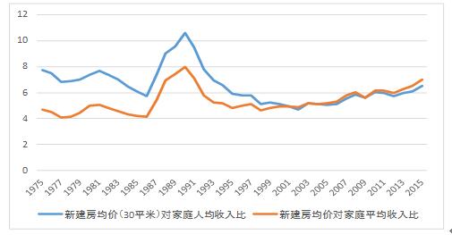 经过10年左右痛苦的调整,2000年以后东京房价渐渐止跌回升。特别是最近几年,在安倍经济学“三支箭”(大胆的金融缓和、积极灵活的财政政策、促进民间投资的成长战略)的刺激下,房价上扬趋势更为明显。不过,引人注目的是,这一波的东京房价上升不仅过程缓和,而且价格水淮也仍在中等收入家庭能承受范围。2015年,东京新建房均价对家庭平均年收入之比为7.0,新建房30平米均价对家庭人均年收入比为6.5(如图)。虽然略高于联合国推荐的合适比值(6以内),但是与这一指标值与高达10以上的中国主要大城市相比,东京的房价水淮可谓偏低。